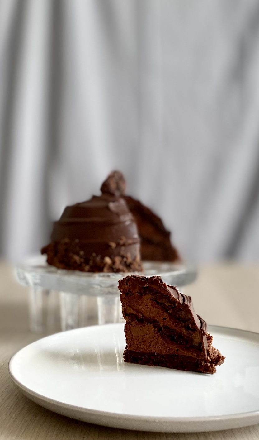 Description: Coming out from the darkness of rich bitter chocolate  and coffee this cake is layered with an indulgent chocolate cream, glazed with Belgium chocolate ganache and topped with a creamy chocolate truffle. Halal, suitable for vegetarians but not vegans.